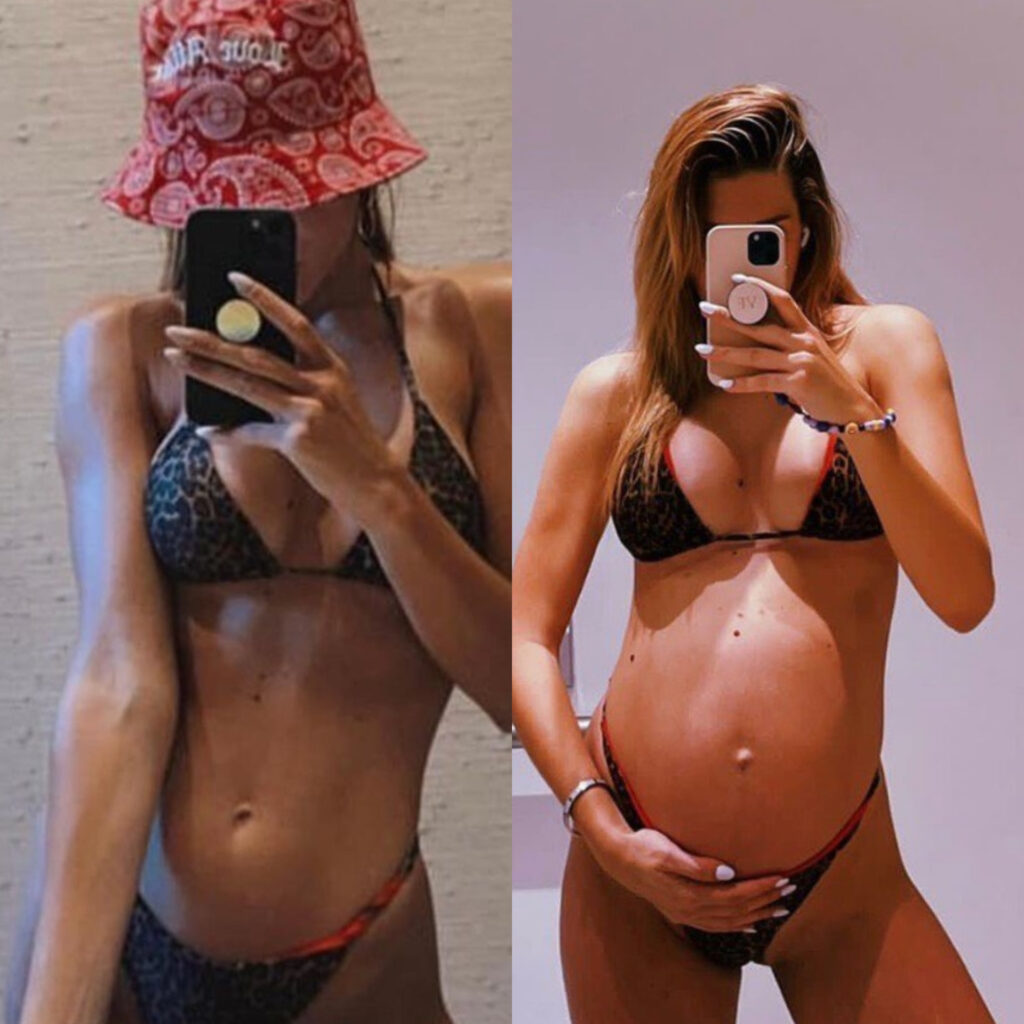 La modelo argentina compartió en su perfil de Instagram dos fotografías, en ambas aparece con el mismo traje de baño pero con la diferencia de que una de las instantáneas es de cuando tenía apenas un mes de embarazo mientras que en la otra tiene nueve meses.