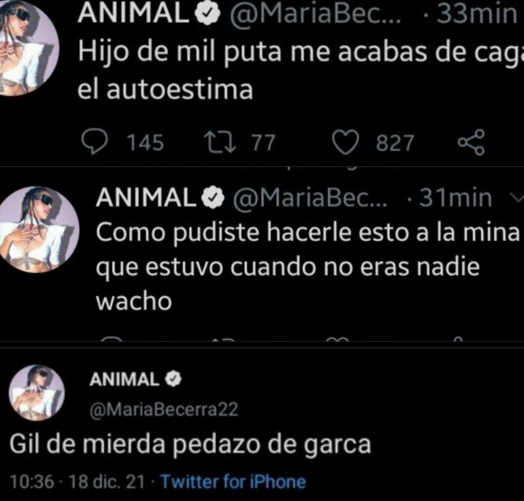 “Hijo de mil puta me acabas de cagar el autoestima”, “como pudiste hacerle esto a la mina que estuvo cuando no eras nadie wacho” y “gil de mierda pedazo de garca”, fueron los tweets que compartió la intérprete de ‘Miénteme’ el sábado en la mañana.