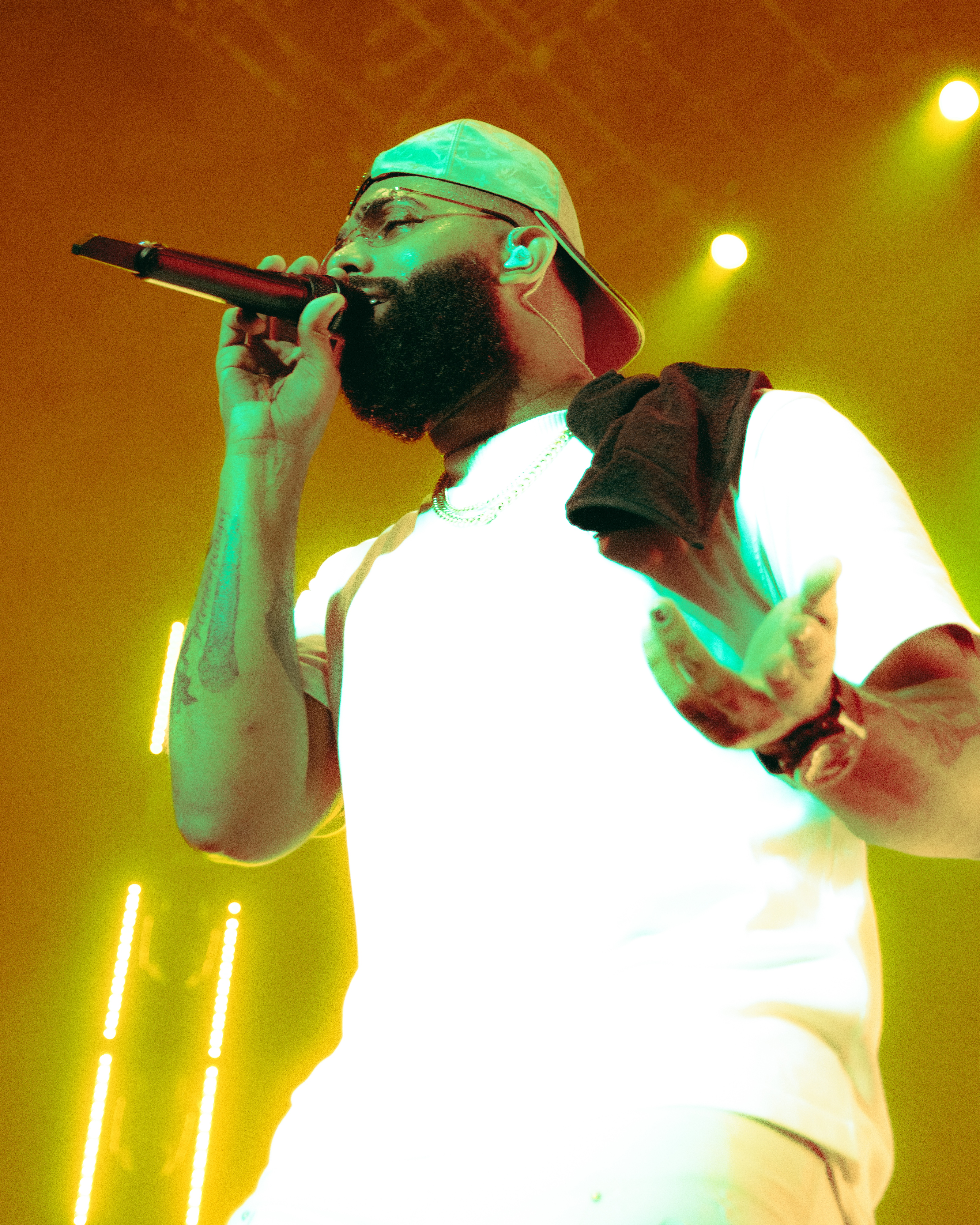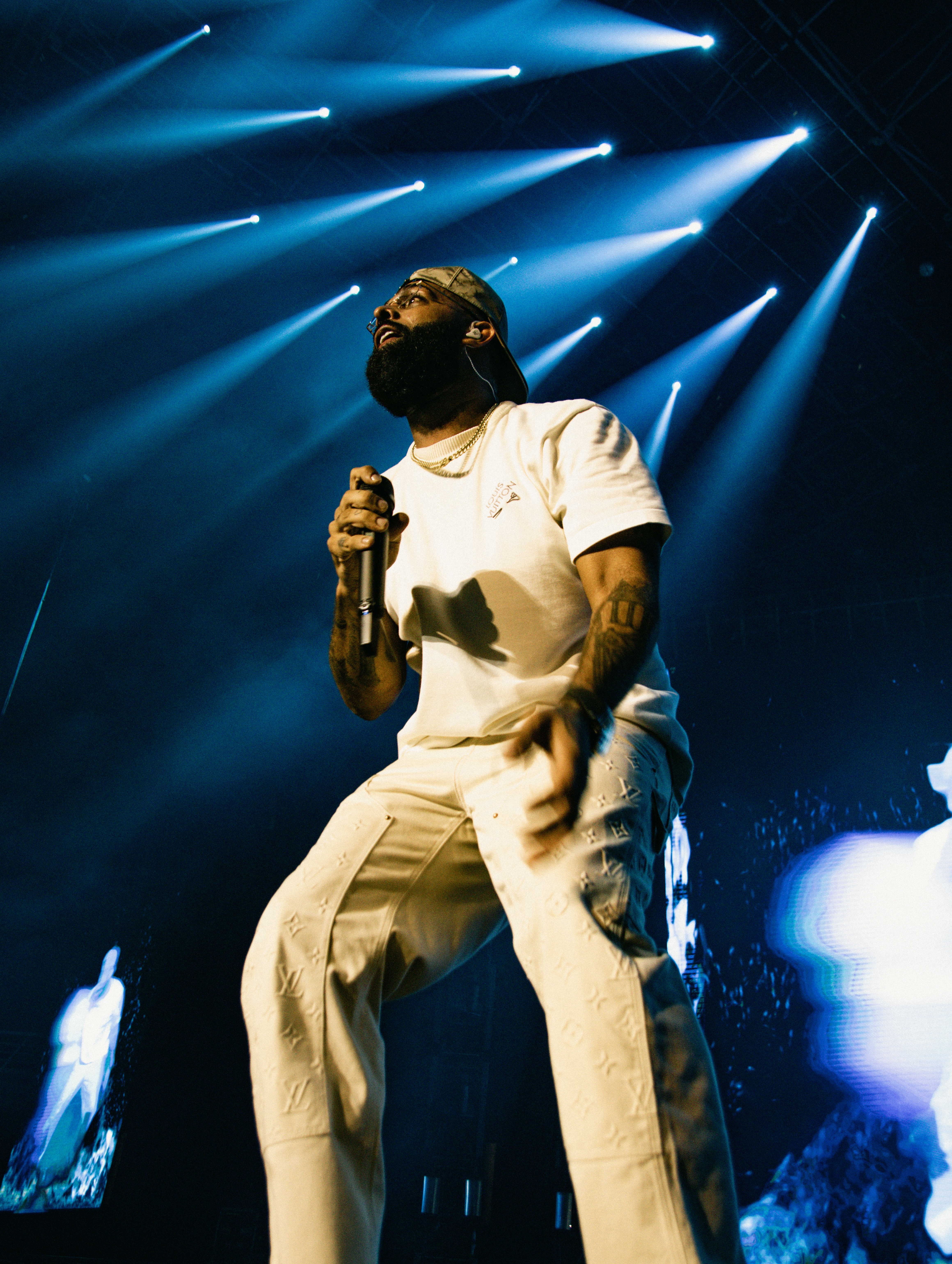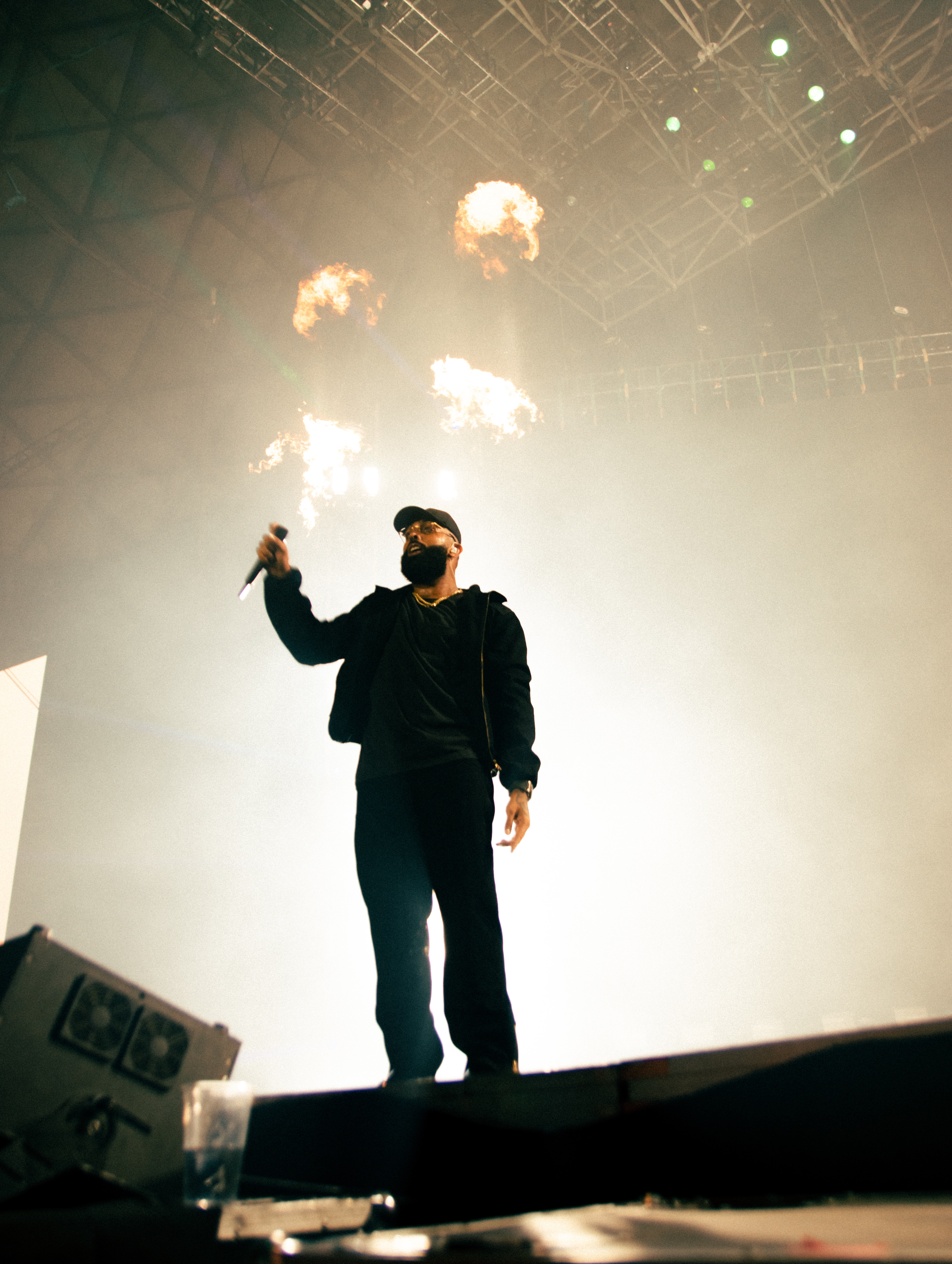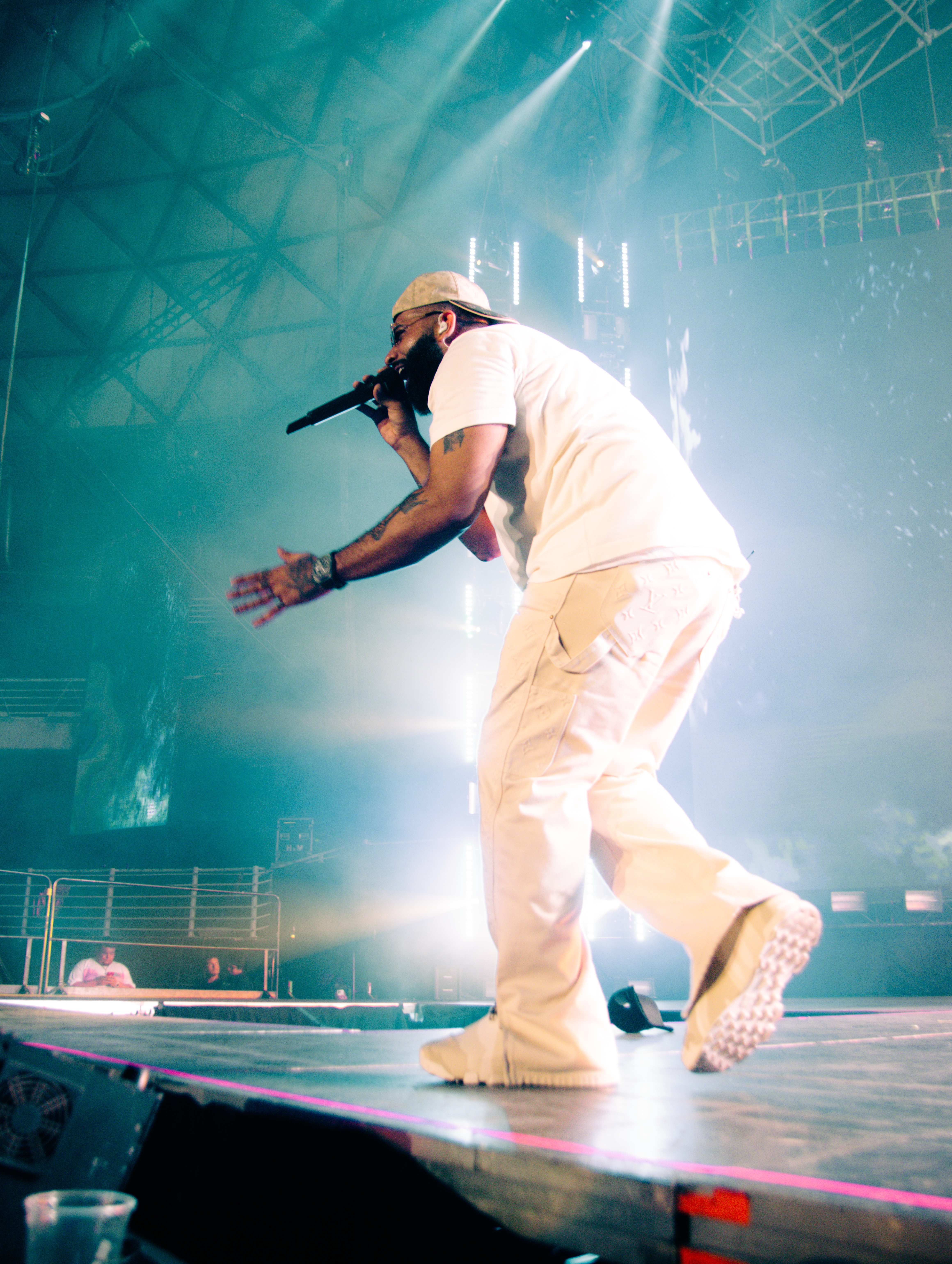 Eladio Carrión pisó el escenario cercano a las 21:30 horas, treinta minutos más tarde de lo estimado y a pesar de la demora, los fanáticos ovacionaron al puertorriqueño a penas sonó la introducción de su canción “Flores en anónimo”.
