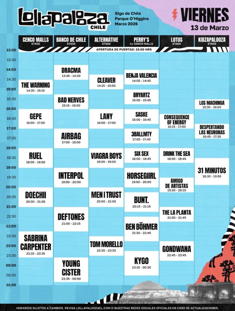 El viernes 13 de marzo tendrá como uno de sus hitos principales la presentación de Sabrina Carpenter, quien cerrará el Cenco Malls Stage entre las 22:15 y las 23:35 horas. La jornada incluirá además a Kygo, Young Cister, Doechii, Interpol, Deftones y Tom Morello, junto a nombres como Ben Böhmer, BUNT., Gondwana y The La Planta, marcando un cruce entre pop global, rock alternativo, electrónica y escena latinoamericana.