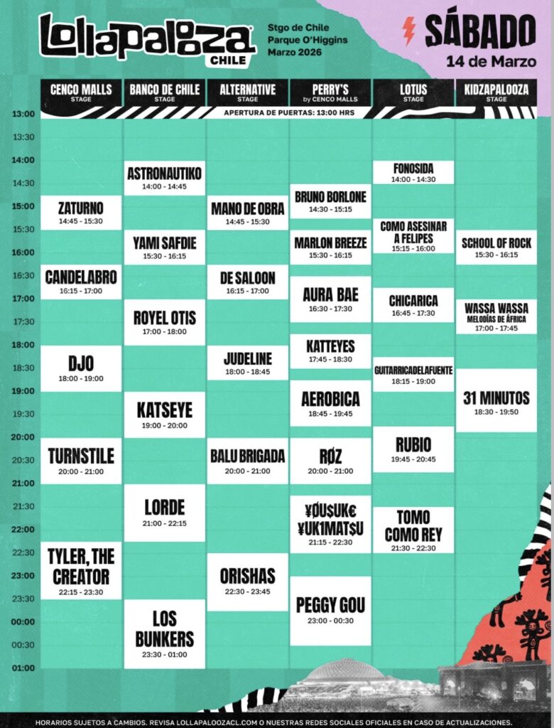 Lollapalooza Chile da a conocer los horarios oficiales de su edición 2026, que regresará al Parque O’Higgins este viernes 13, sábado 14 y domingo 15 de marzo. Con apertura de puertas programada para las 13:00 horas cada jornada, el evento desplegará una programación que se extenderá hasta pasada la medianoche, distribuyendo a sus artistas en los escenarios Cenco Malls, Banco de Chile, Perry’s, Cúpula y Kidzapalooza, el festival promete tres días de encuentros musicales imperdibles que reúnen a lo mejor del pop, la electrónica, el rock y la escena local.
