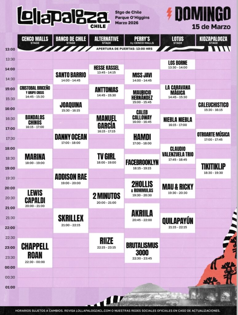 El domingo 15 de marzo marcará el cierre del festival con Chappell Roan en el Cenco Malls Stage entre las 22:30 y la medianoche. La jornada final contará además con Skrillex, Lewis Capaldi, Addison Rae, Danny Ocean, TV Girl, Quilapayún, RIIZE y Brutalismus 3000, configurando un último día que combina pop, electrónica y propuestas emergentes.