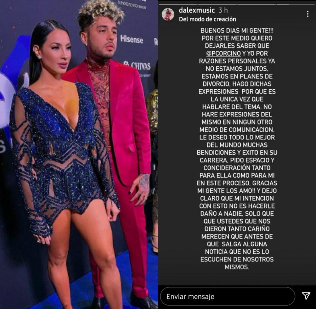 Este martes el cantante puertorriqueño Dalex, informo a través de su historia de Instagram que se divorciara de la presentadora y modelo Patricia Corcino, con quien contrajo matrimonio el pasado 2020.